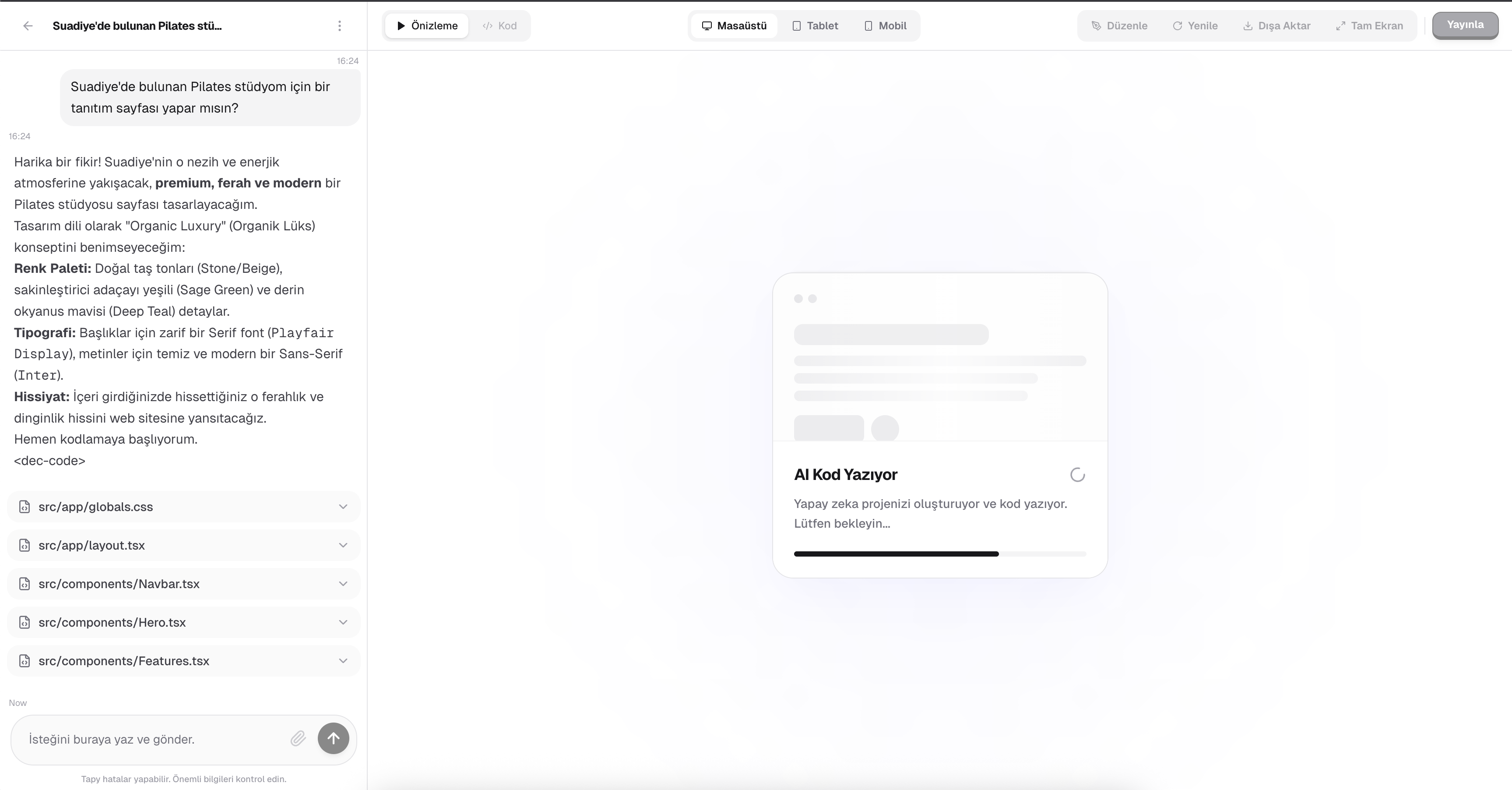 Aklınızdaki web sitesini sadece birkaç cümleyle anlatın. Tapy, niyetinizi saniyeler içinde anlar ve profesyonel bir taslak oluşturur.